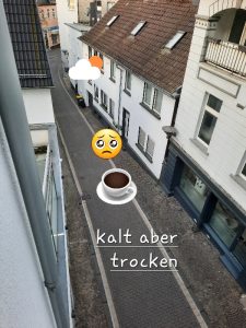 In unserer Gasse ist es noch ruhig und mittlerweile hell geworden, vom Frost ist hier nichts zu sehen. Jetzt erstmal